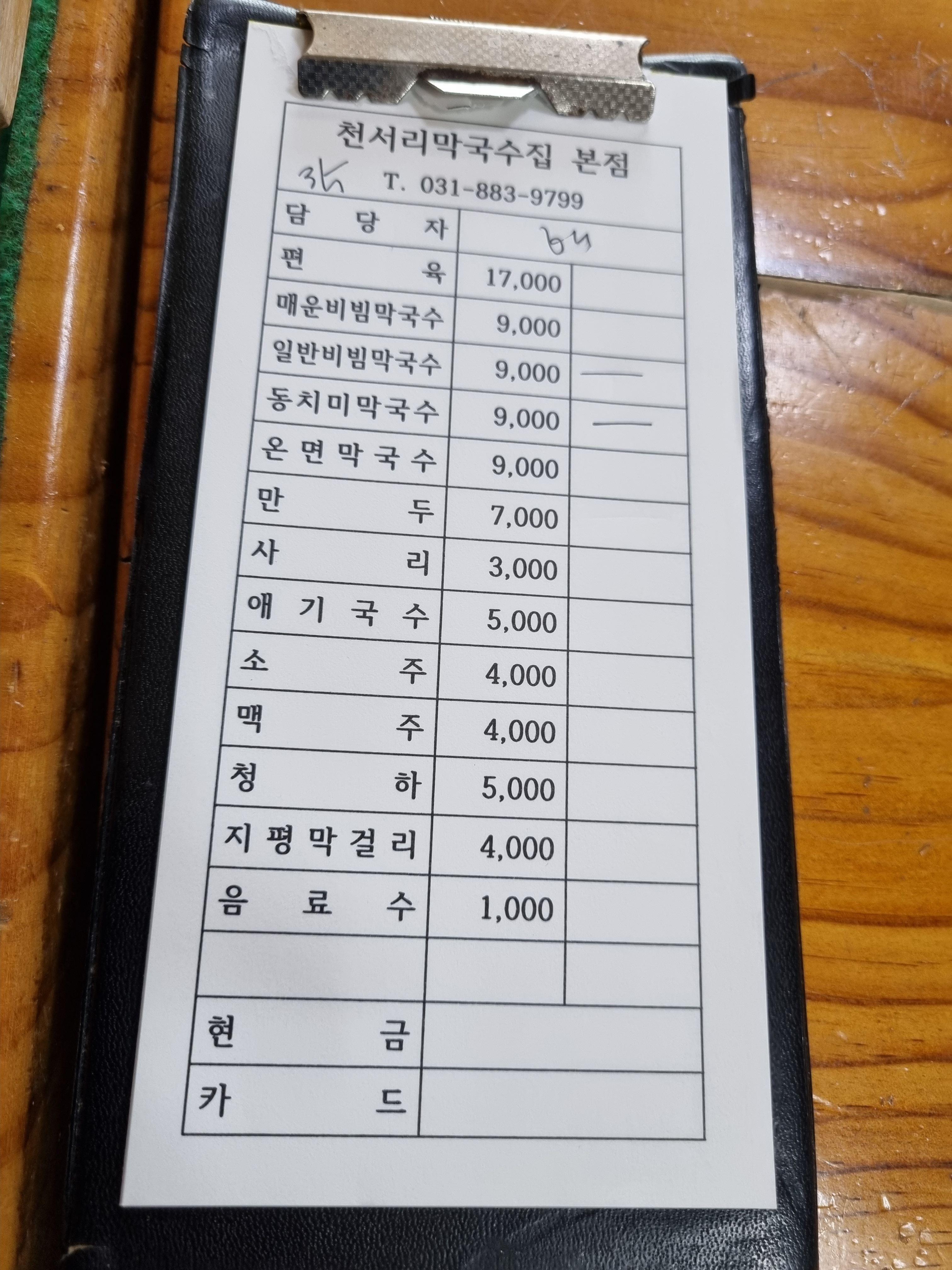 천서리막국수 메뉴판입니다.