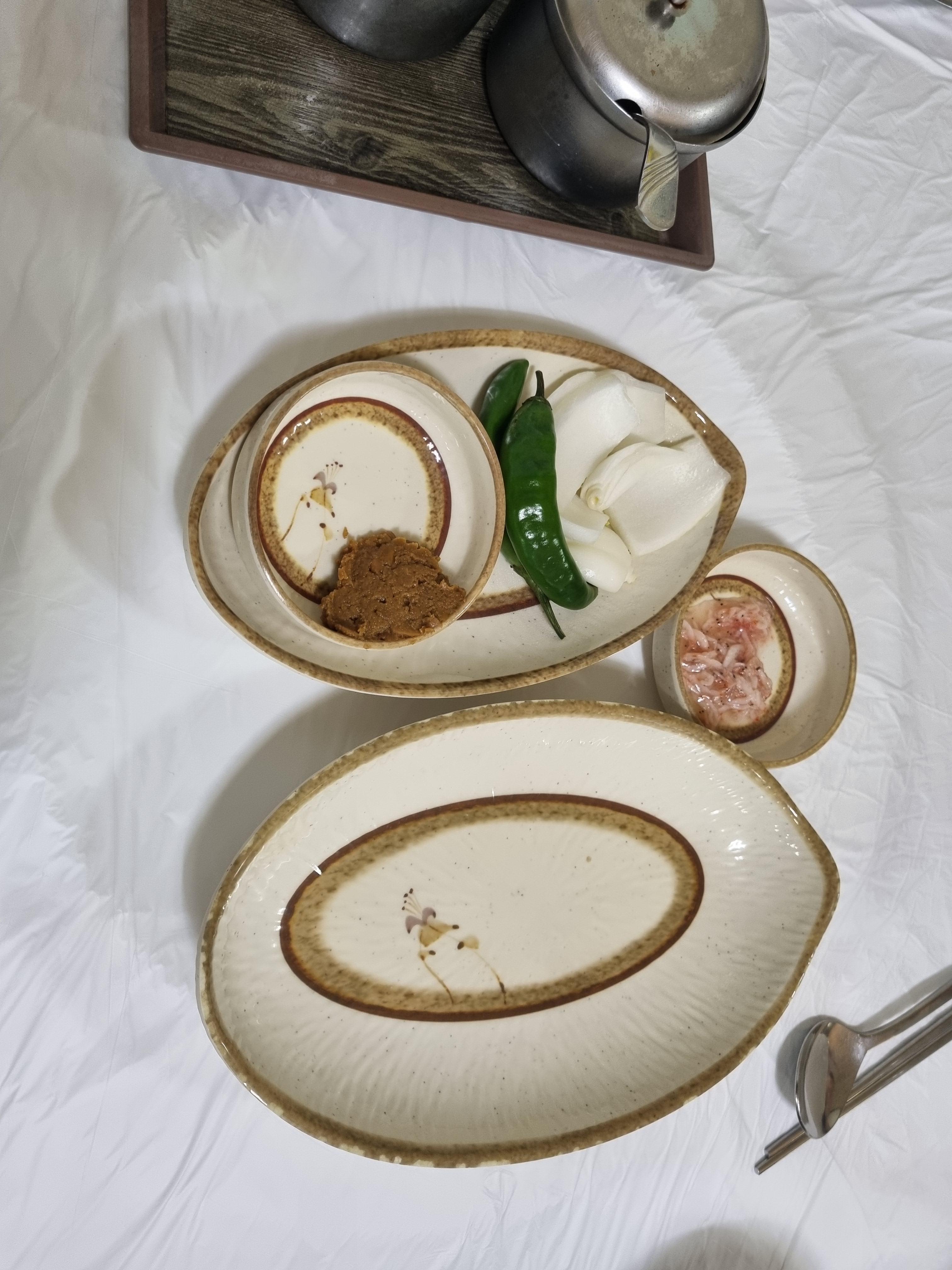 기본반찬인 깍두기.배추김치.양파.고추입니다.