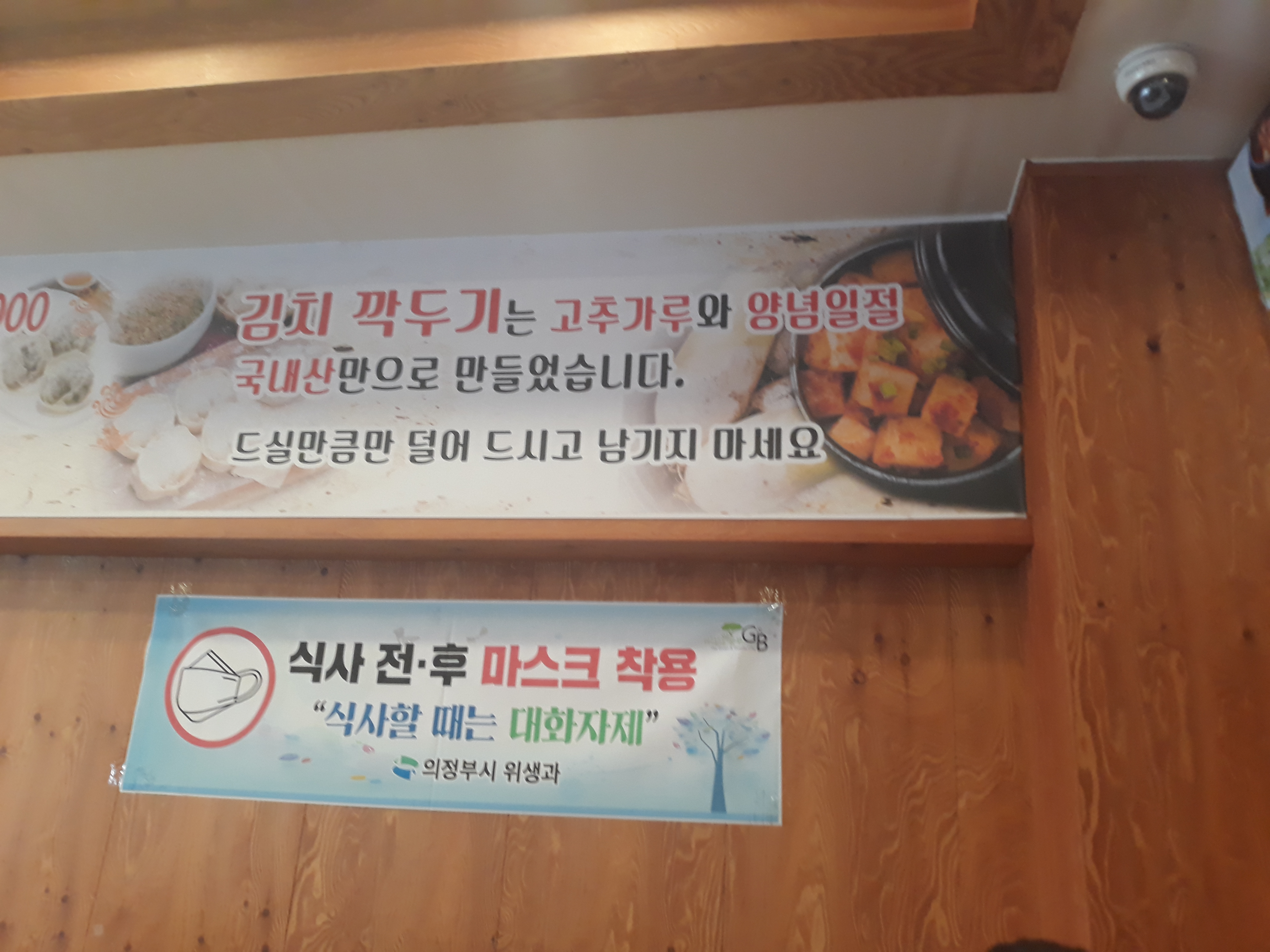 기본반찬으로 김치와 깍두기가 통에 담겨있고 재료를 국내산으로 쓰신다고 대문짝만하게 플랜카드가 붙여져 있습니다.