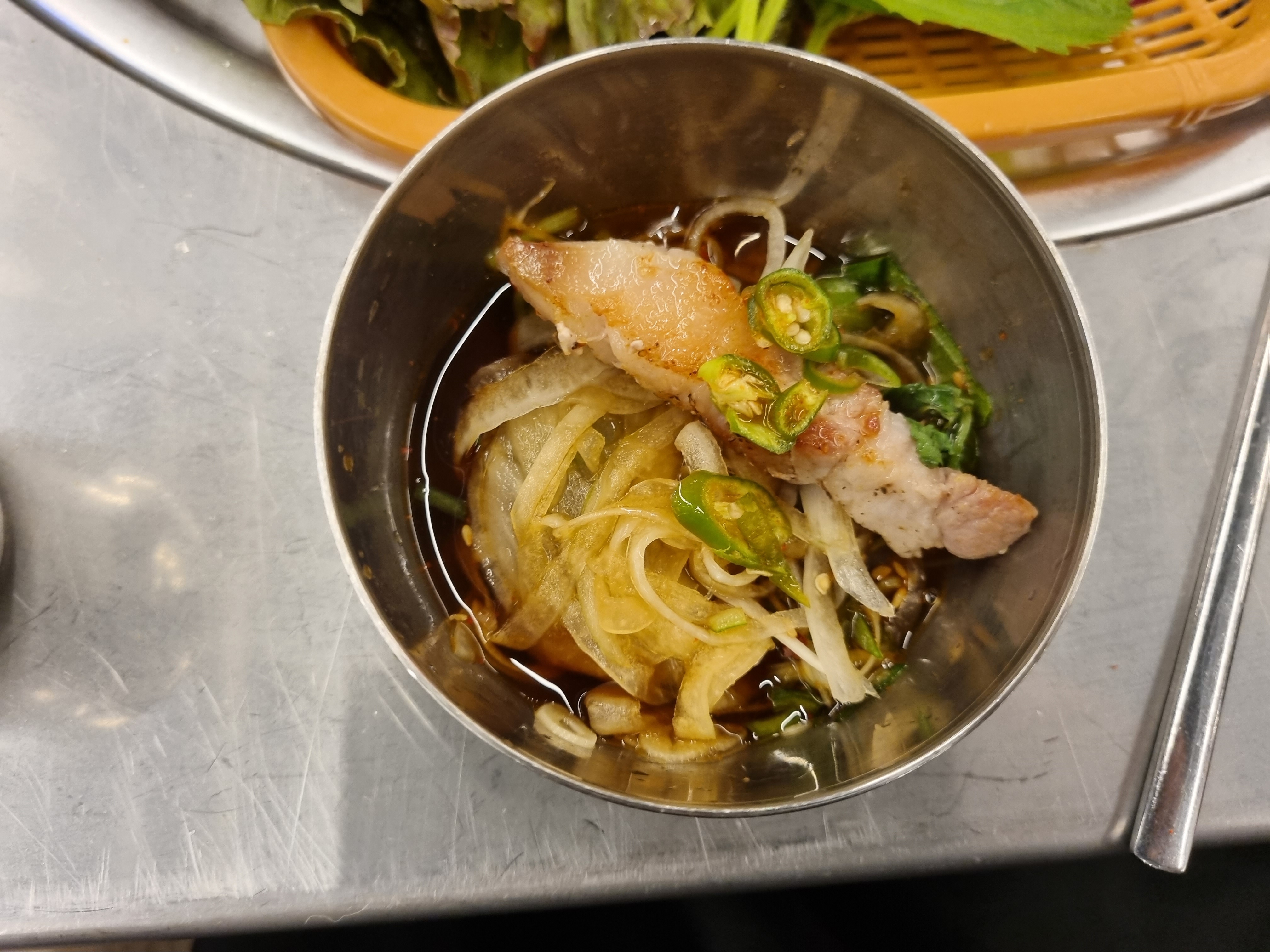 양파절임에도 삼겹살 한점 올려서 먹습니다.
