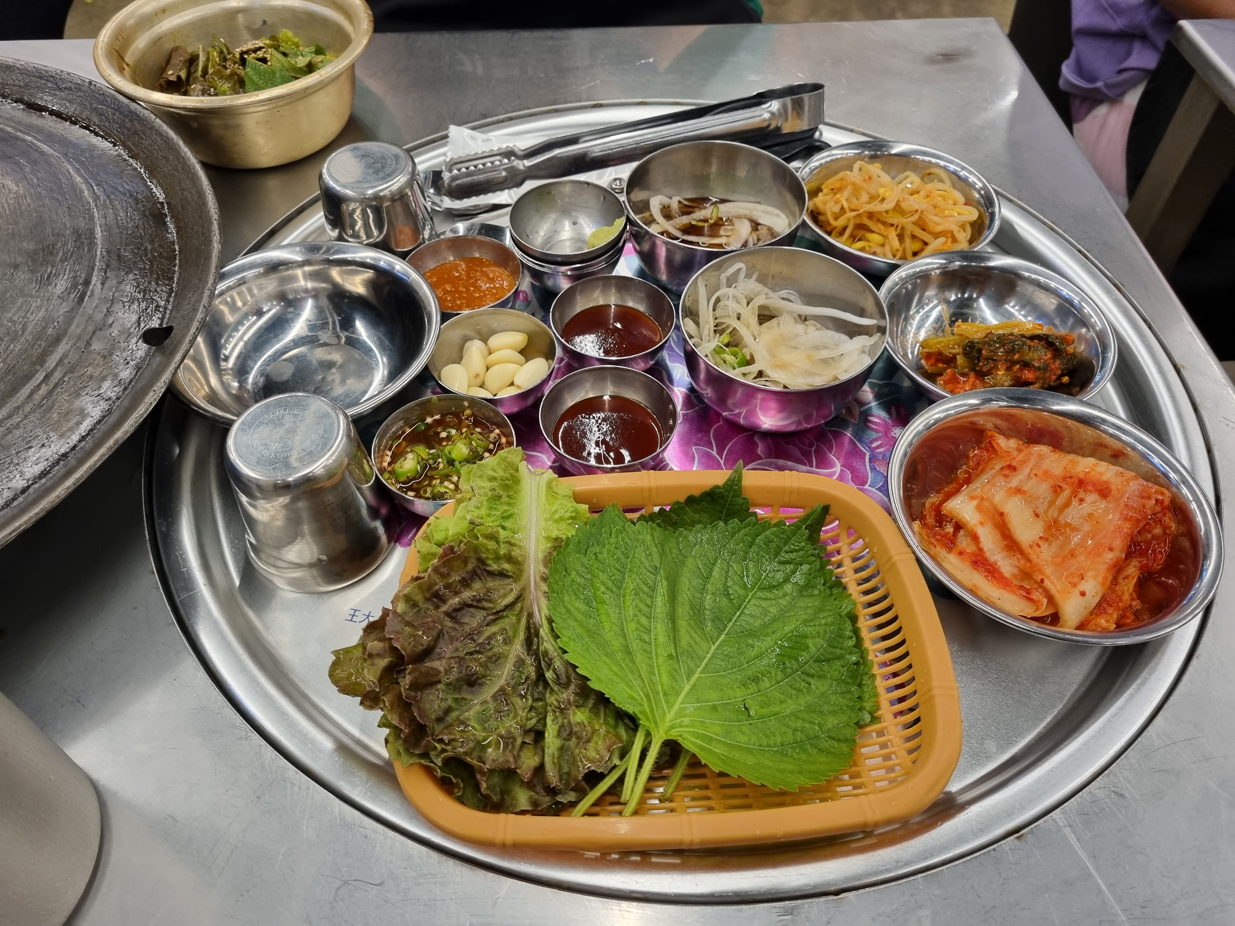 상추.깻잎.배추김치.갓김치.양파파절임이 있고